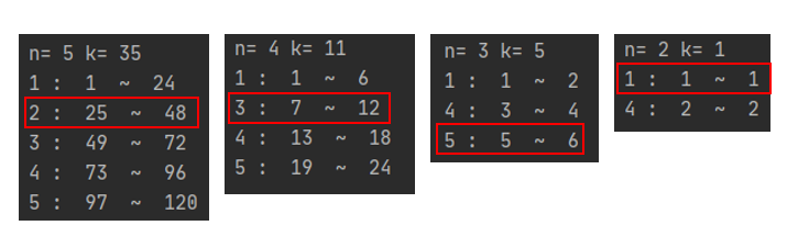 ๋ค์ ์คํ ์ผ๋ก ๋์ด๊ฐ๋ฉด n = 4, k = 35 - 24 = 11์ด๋ค. ์ฆ, ๋งจ 2 ์ด์ ์ ์ซ์์ธ 1์ด ๋งจ ์์๋ฆฌ์ ์ค๋ ๊ฒฝ์ฐ๋ 24๊ฐ์ง๋ฅผ ์ ๋ถ ์ง๋์น๊ณ 2๊ฐ ๋งจ ์์ผ ๋ 11๋ฒ์งธ ์ซ์๋ฅผ ์ฐพ๋ ๊ฒฝ์ฐ์ด๋ค.