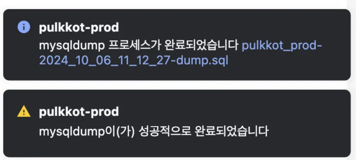 4. 아래와 같은 창이 뜨는데, 실행경로가 문제라고 나옴. 직접 폴더를 선택해주자. 나의 경우 (/usr/local/mysql-8.4.0-macos14-x86_64/bin/mysqldump) 설치한 mysql → bin → mysqldump 파일 실행